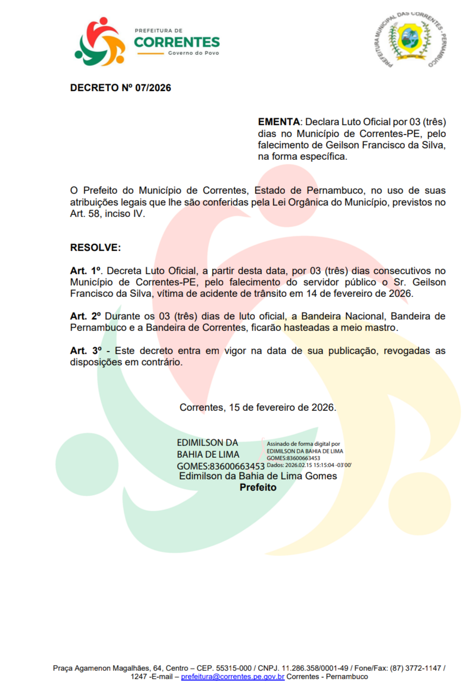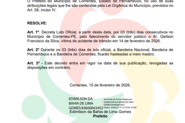 EMENTA: Declara Luto Oficial por 03 (três) dias no Município de Correntes-PE, pelo falecimento de Geilson Francisco da Silva, na forma específica. O PREFEITO DO MUNICÍPIO DE CORRENTES, Estado de Pernambuco, no LER MAIS