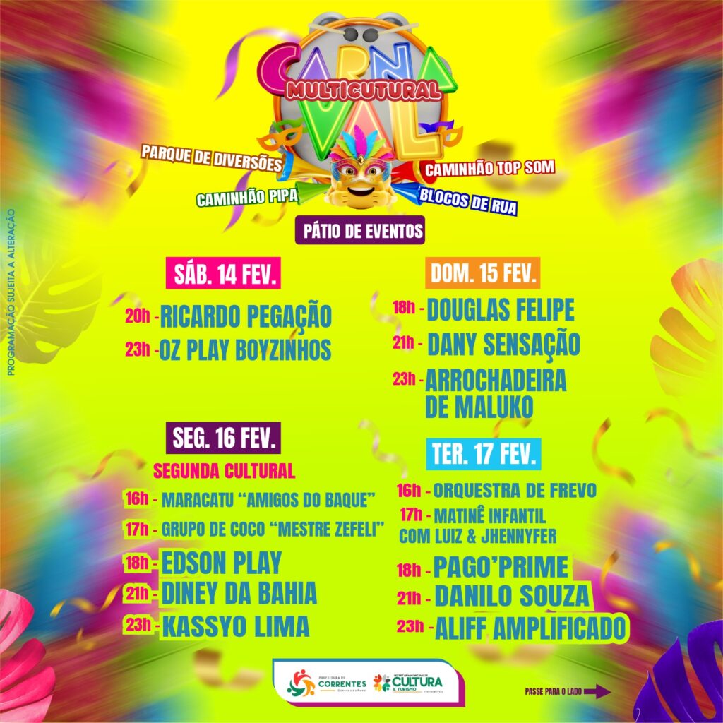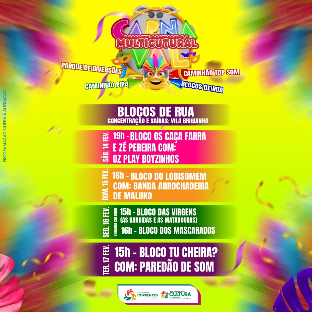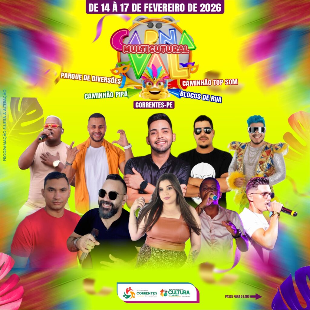 A Prefeitura de Correntes, por meio da Secretaria Municipal de Cultura e Turismo, apresenta o Carnaval Multicultural 2026, uma grande celebração da cultura popular, da música e da diversidade, que promete movimentar a cidade com uma programação ampla, democrática e para todas as idades.