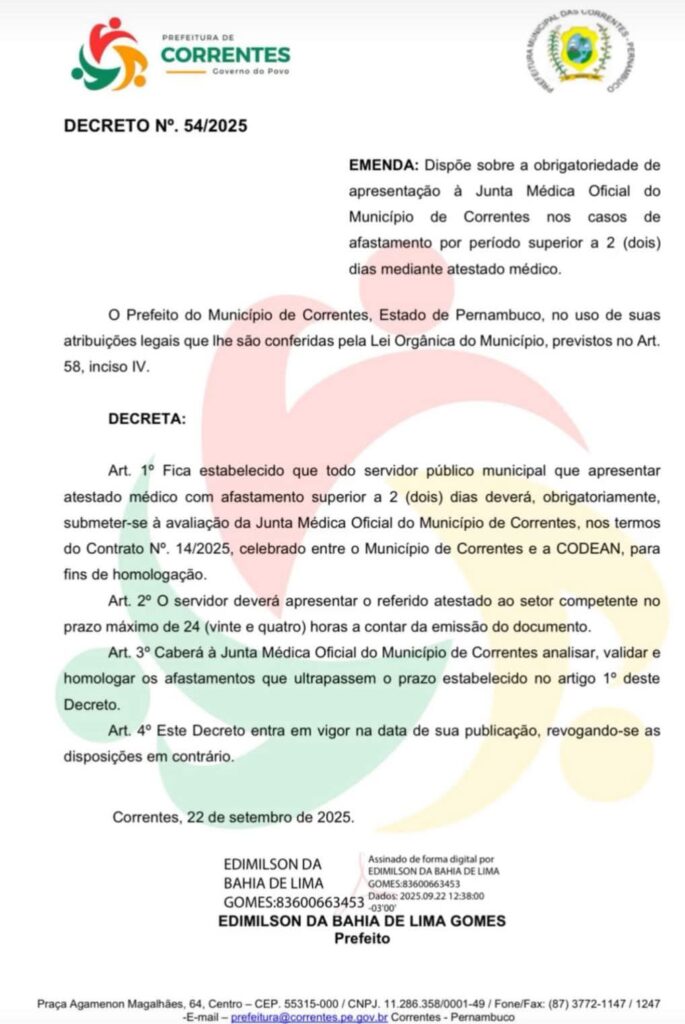 Art. 1º Fica estabelecido que todo servidor público municipal que apresentar atestado médico com afastamento superior a 2 (dois) dias deverá, obrigatoriamente, submeter-se à avaliação da Junta Médica Oficial do Município de Correntes, nos termos do Contrato nº 14/2025, celebrado entre o Município de Correntes e a CODEAN, para fins de homologação.